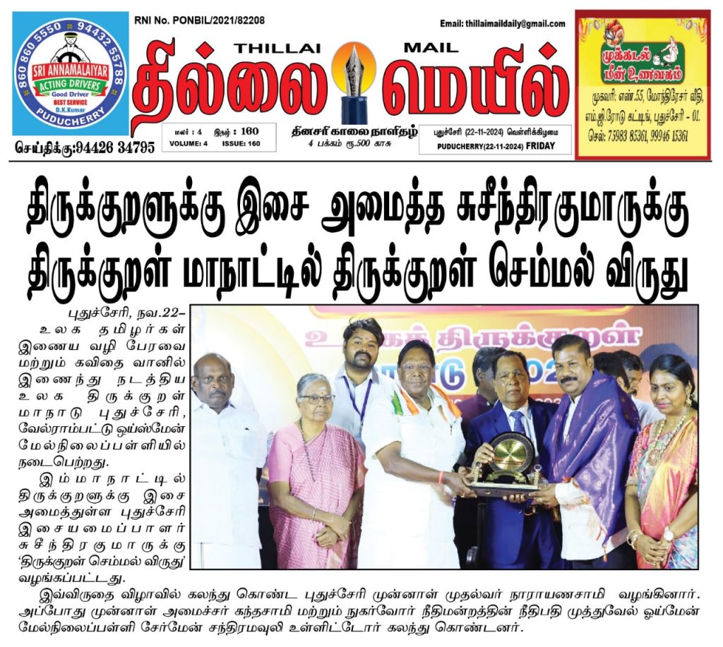 A grand celebration of Tirukkural was held in Puducherry as part of the National Tirukkural Festival. Renowned music director Shanthakumari was honored for her contributions to spreading Tirukkural through music. The award was presented by former Chief Minister N. Rangasamy in the presence of esteemed dignitaries and legal officials. The event celebrated the enduring influence […]